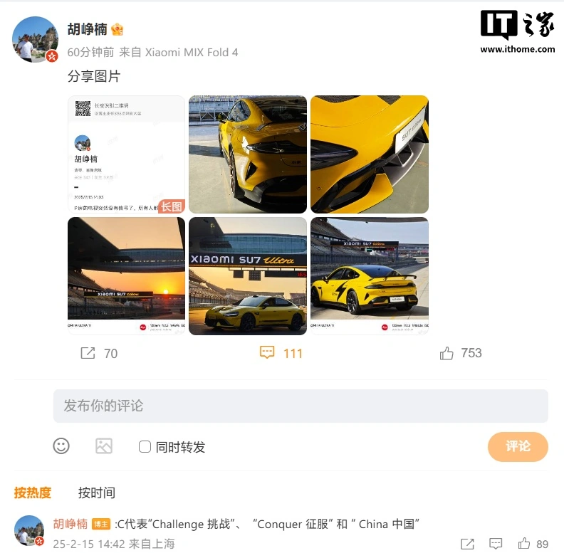 2月15日,顺为资本投资合伙人胡峥楠在微博分享了小米SU7 Ultra在上海国际赛车场的挑战经历。小米SU7 Ultra在赛道上取得了2分09秒944的成绩,超越了保时捷Taycan Turbo GT Weissach Package的2分11秒28,成为上海国际赛车场最速量产车。这一成绩不仅是对小米汽车技术实力的验证,也是小米汽车文化和工程师文化的结晶。