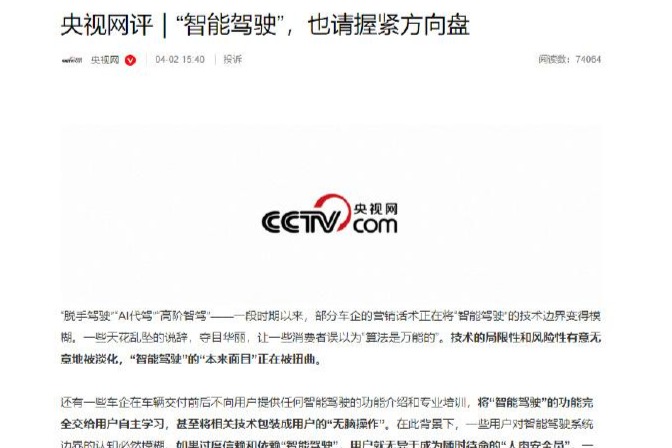 4月2日,央视网就智能驾驶引发的交通事故发表评论,强调驾驶员在使用智能驾驶功能时仍需紧握方向盘。央视网指出,部分车企在营销中模糊了智能驾驶的技术边界,误导消费者认为算法是万能的,忽视了技术的局限性和风险。同时,一些车企在交付车辆时未提供智能驾驶功能的介绍和培训,让用户自主学习,甚至将其宣传为“无脑操作”。