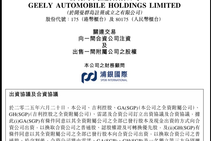 6月20日,吉利汽车在港交所公告,公司与吉利控股、全资附属公司GA (SGP)、吉利控股全资附属公司GH (SGP)、雷诺及合资公司订立出资协议及合资协议。GA (SGP)将向合资公司出资,换取普通股、认股权证及可转换优先股;GH (SGP)将向合资公司出资,换取普通股。交割后,合资公司将由雷诺、GA (SGP)、GH (SGP)及一名独立第三方分别拥有73.57%、21.29%、5.11%及0.03%的权益。合资企业行政总裁将由董事会根据雷诺的建议委任。