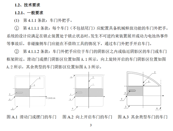 技术要求规定,每个车门(不包括尾门)应配置具备机械释放功能的车门外把手。在锁止装置处于锁止状态时,发生不可逆约束装置展开或动力电池热事件等事故后,非碰撞侧车门应能在不借助工具的情况下,通过车门外把手开启车门。此外,每个车门的车门外把手在任意状态时,相对车身表面应具备手部操作空间,该操作空间应不小于60mm x 20mm x 25mm。同时,每个车门(不包括尾门)应配置具备机械释放功能的车门内把手,按规定的方法进行试验,应能在不借助外部工具的情况下,通过具备机械释放功能的车门内把手释放门锁并开启车门。若装备电动式车门内把手应同时配备具有机械释放功能的车门内把手,作为机械应急车门内把手。