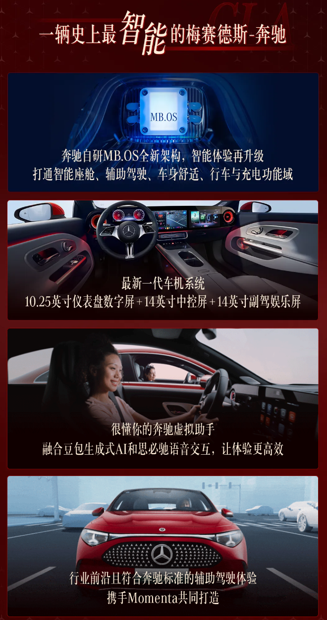 9月25日,梅赛德斯-奔驰宣布其全新纯电动CLA开启预售,提供300L超长续航版和300L超长续航领智版两个版本,售价分别为25.9万元和29.9万元。新车采用全新轿跑设计语言,前脸142颗星徽可呼吸式动态点亮,轴距达2830mm,前备箱+后备箱储物空间超500升,提供5款车色选择。全新纯电CLA被誉为“史上最智能的梅赛德斯-奔驰”,搭载MB.OS全新架构,整合智能座舱、辅助驾驶、车身舒适、行车与充电功能域。车内配备10.25英寸仪表盘数字屏、14英寸中控屏和14英寸副驾娱乐屏,集成奔驰虚拟助手和语音交互技术。