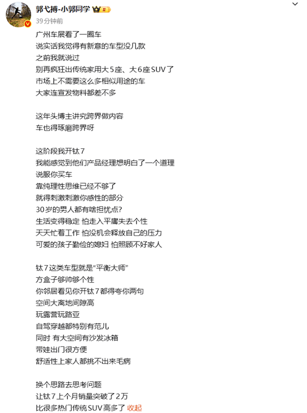 钛7的设计被描述为“平衡大师”,其方盒子造型不仅帅气,还能吸引邻居的称赞。车辆的空间宽敞,离地间隙高,适合露营、路亚和自驾穿越等户外活动,展现出独特的生活态度。同时,钛7的大空间和便利设施,如沙发和冰箱,使得带娃出门变得轻松,舒适性也得到了家人的认可。这些特点使得钛7在众多SUV车型中脱颖而出,成为市场上的热门选择。
